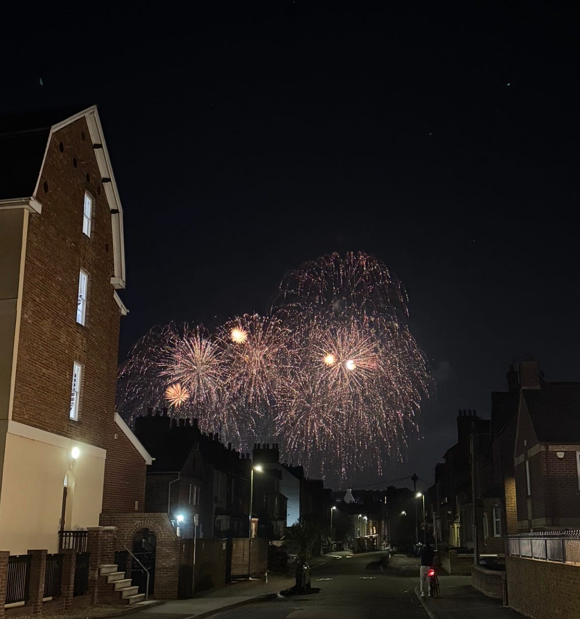 None of us knew each other, but for a moment, we were united by the simple desire to see something pretty. We did not ooh and ahh as we might have done in a crowd. The street was silent, illuminated by headlights, bike lights, the occasional fairy lights in a window, and of course, the fireworks. From this distance, they seemed gentle. The sound was not a boom, but a pop.